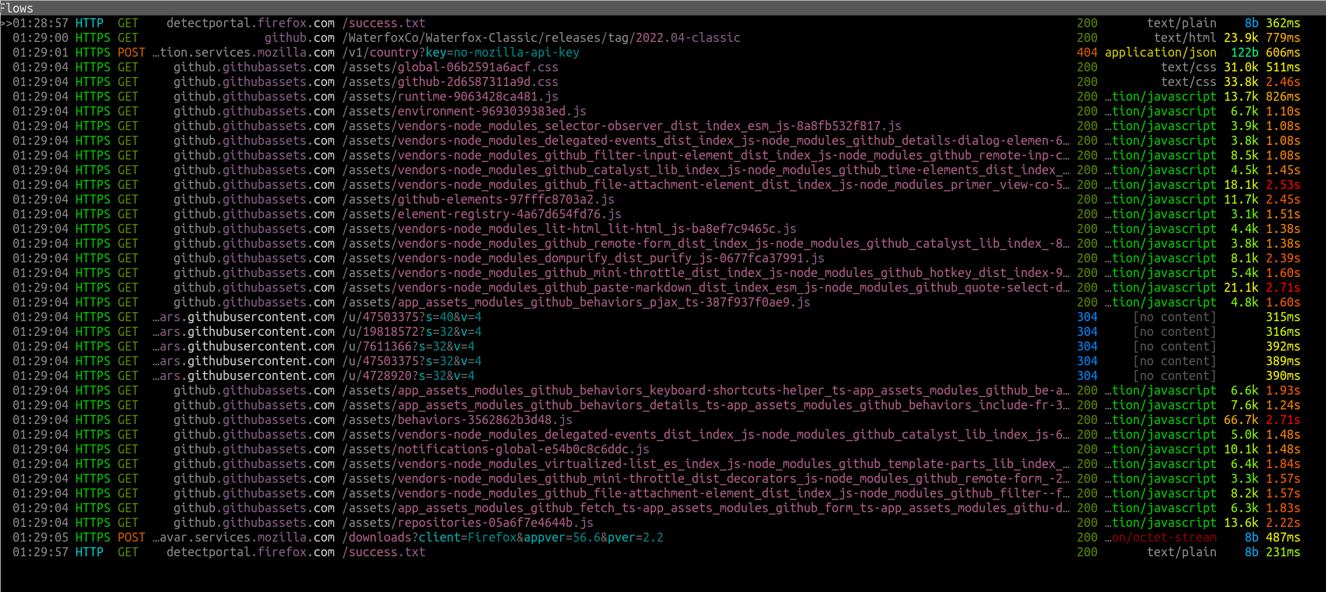 If you start up Waterfox for the first time, it will make between 31 to 130 requests (most of them being version checks)[4] to several spyware platforms, notably Matomo, and Mozilla online services like its Geolocation service, and several other Mozilla services, as well as Waterfox's own update service. You can look at a list of these requests here.